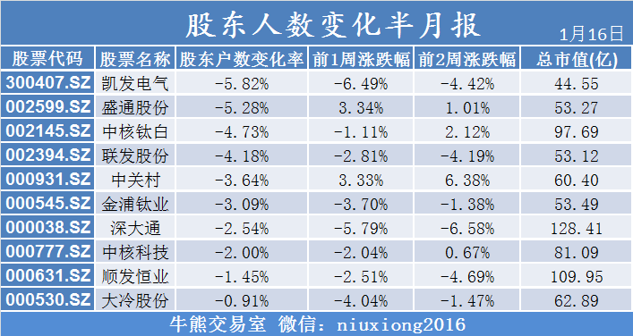 牛熊交易室统计发现,近一期股东人数下降的公司11只,剔除近6个月上市股后,近半月公布股东户数,与上期相比人数下降的个股10只,流通市值都在110亿以下。